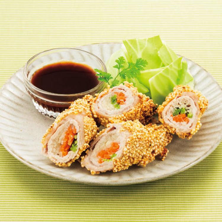 塩・こしょうを振った豚肉1枚に8等分したAをのせて巻き、小麦粉・混ぜ合わせたB・(1)を順にまぶす。これを計8個作ってホイルに並べ、オリーブ油を回しかけたらオーブントースター(1000W)で約9分焼く。
