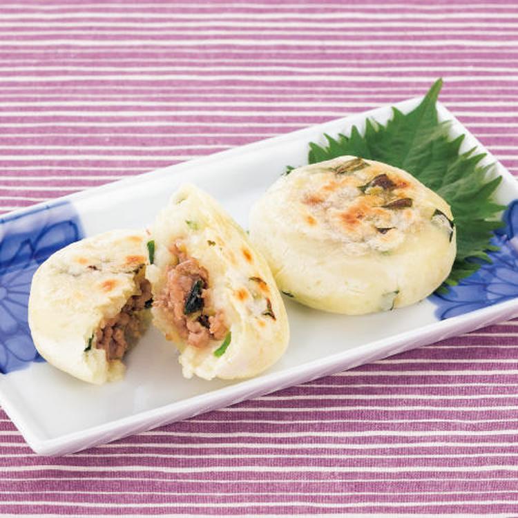 じゃが芋は竹串が通るくらいのやわらかさにゆで、水気を切ってつぶす。半量のニラ・片栗粉と水1/4カップを少しずつ加えて耳たぶくらいの固さにまとめ、8等分する。