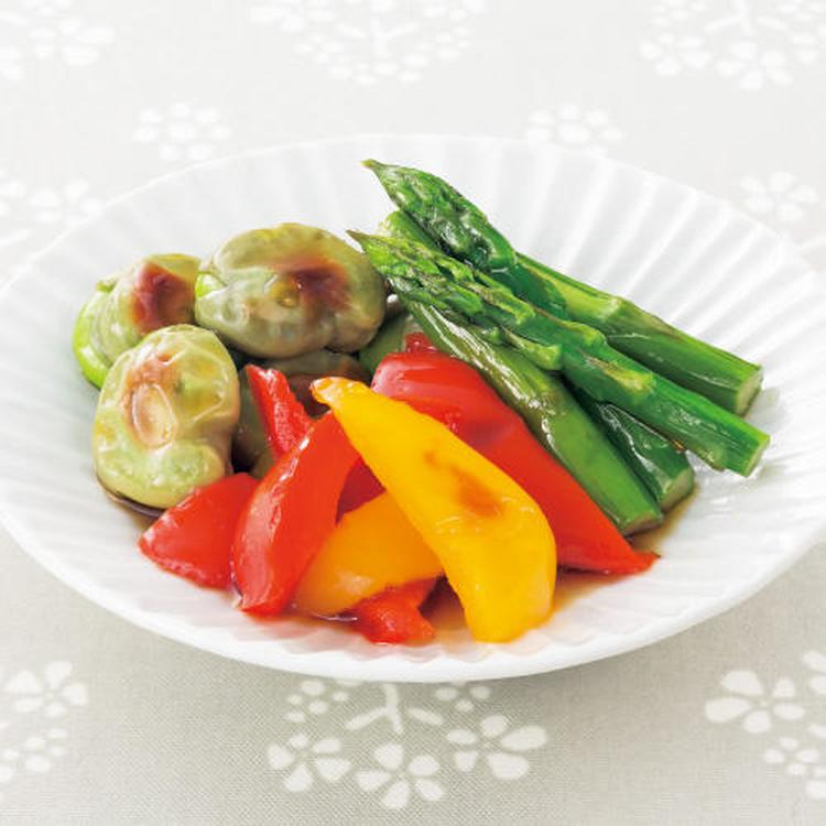 ホイルを敷いた天板にサヤを除いたそら豆・パプリカ・アスパラを並べ、オーブントースター(1000W)で焼き色が付くまで焼く。