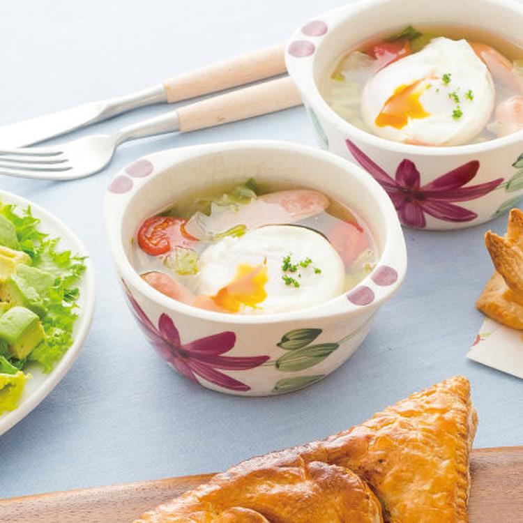 鍋に分量外の水を沸騰させて酢を入れ、卵を1個ずつ静かに割り入れ、白身を寄せながら形を整え、ポーチドエッグを作る。
