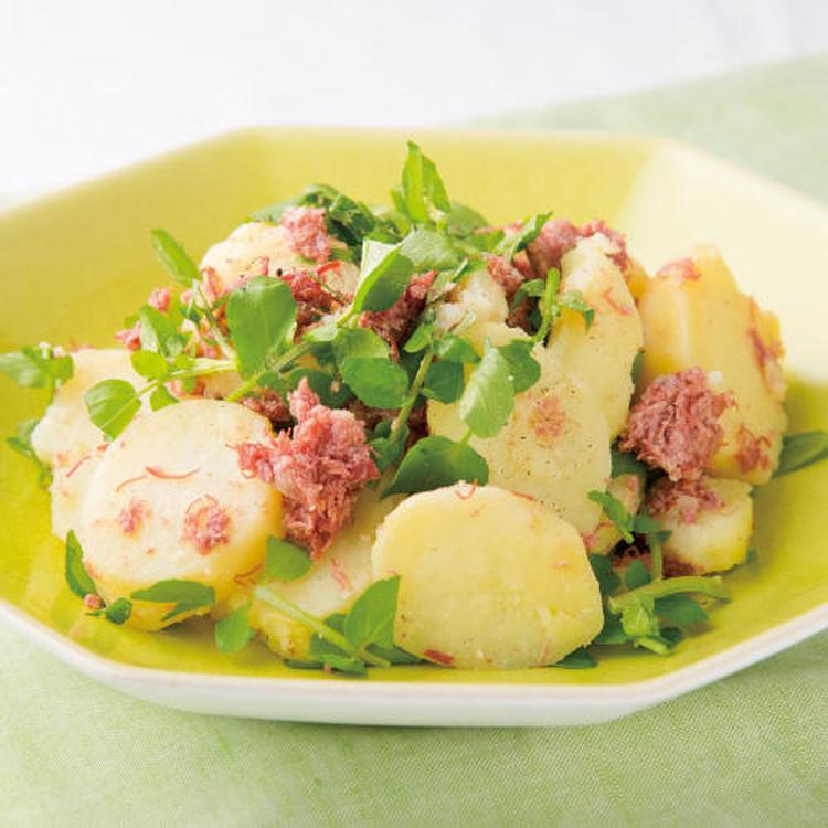 (1)をボウルに入れて熱いうちにAで和え、コンビーフ、オリーブ油を加えてさっと合わせる。