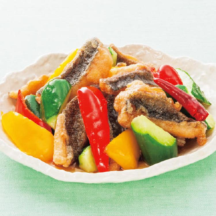 中温の揚げ油でBを色よく揚げて(2)に浸ける。続けて(1)をカラリと揚げて(2)に浸ける。