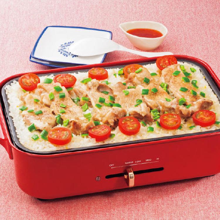 ホットプレートに洗った米・A・水350mlを入れて混ぜ合わせ、(1)・白ねぎの青い部分を順にのせる。蓋をして高温でスイッチを入れ、沸騰したら中温で約10分加熱する。