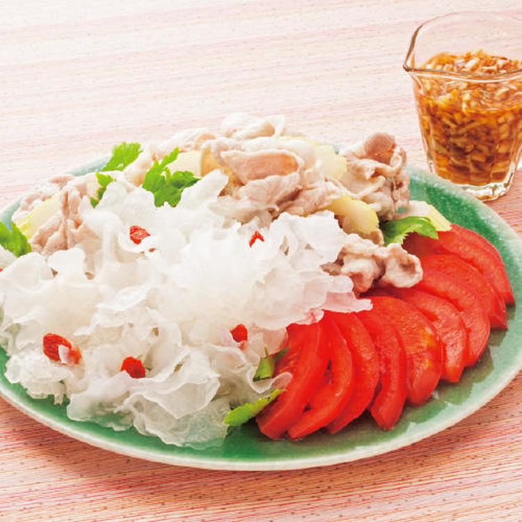 鍋に白きくらげを入れてたっぷりの水で戻し、中火でやわらかくなるまでゆでる。水気を切り、硬い部分を除いて食べやすい大きさにちぎる。