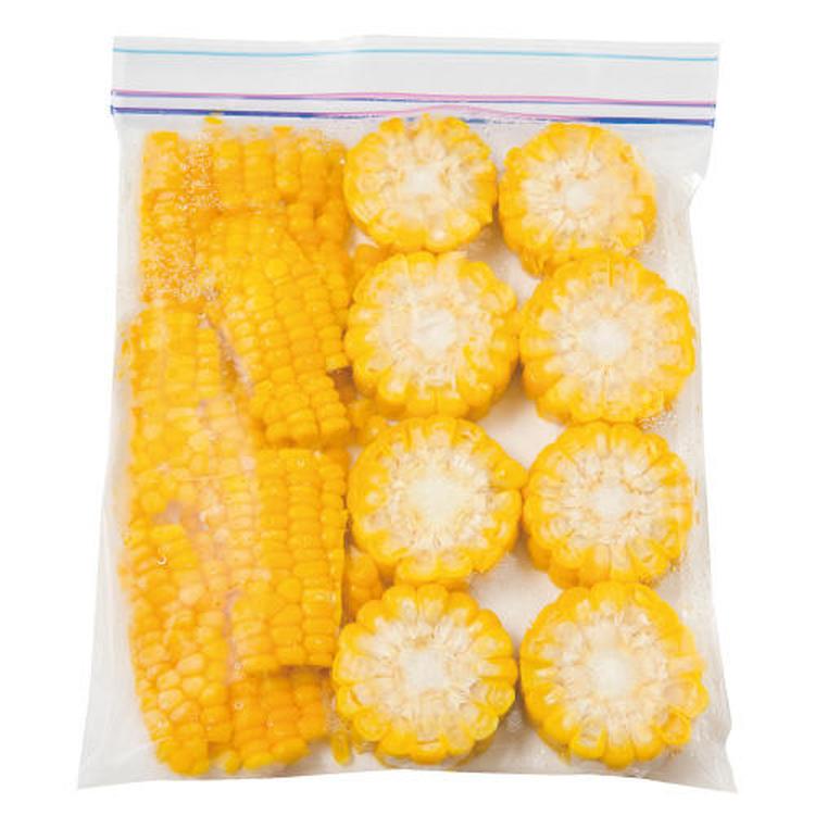(1)の茎側の付け根から2cmほど実の部分を切り落とし、ヒゲ側を持ってとうもろこしを軽く振り、実だけを抜き取る(実が抜けきらない場合は、皮に切り込みを入れるとむけやすい)。