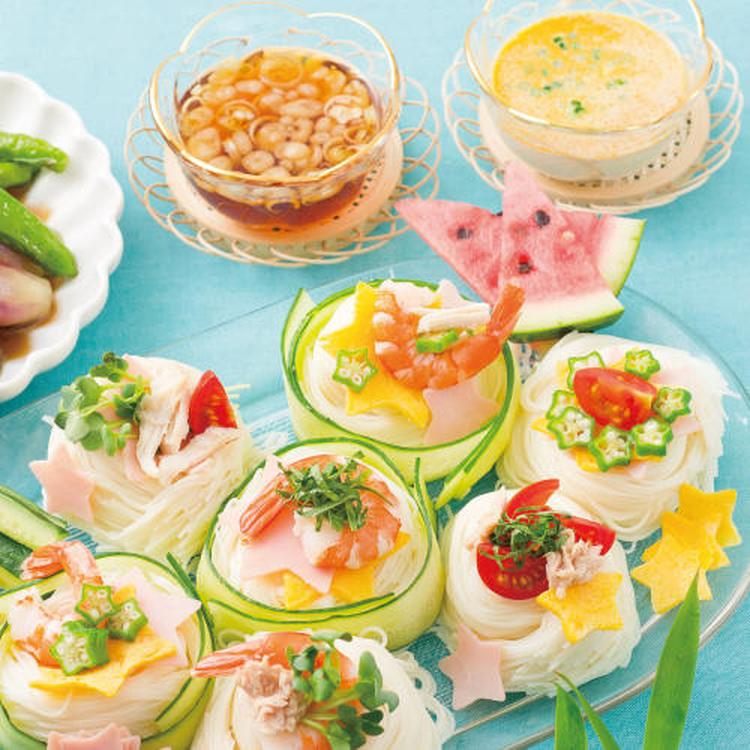(2)のいくつかをきゅうりで囲み、好みの具材をのせたり添えたりして飾る。