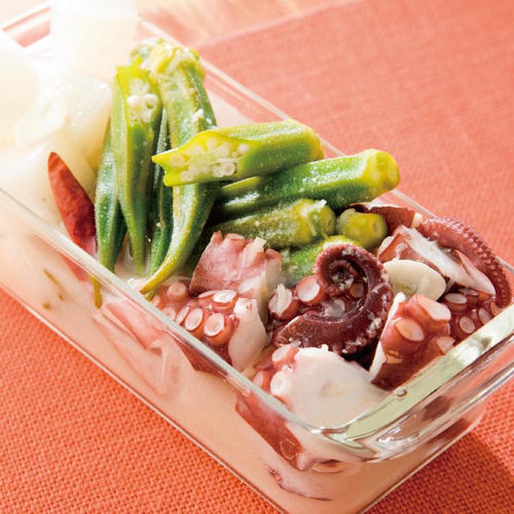 密閉袋にAを入れて軽くもみ合わせ、たこ、オクラ、(1)を加えて冷蔵庫で半日ほど漬け込む。