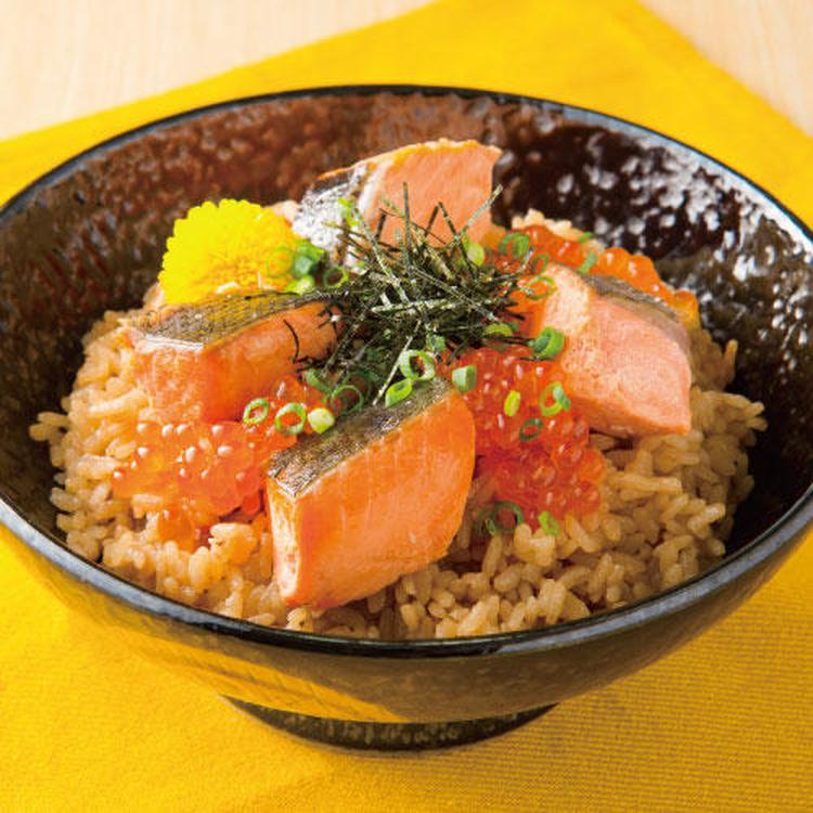 炊き上がったご飯を器に盛り、(1)の鮭、イクラをのせて青ねぎを散らし、Bを添える。