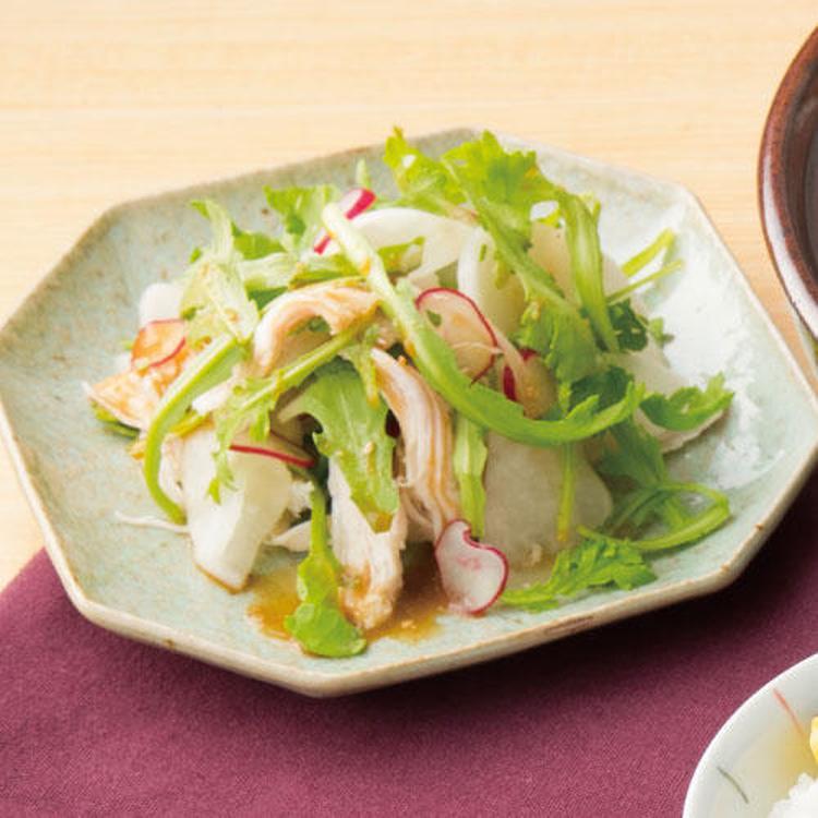 (1)、春菊、サラダチキンを、合わせたAで和える。