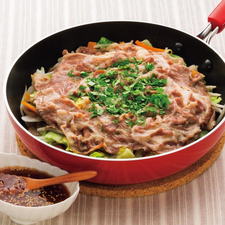 フライパンに半量のカット野菜を広げ、その上に半量の豚肉を広げる。同様にもう1段重ねて酒を回しかけ、塩を振る。