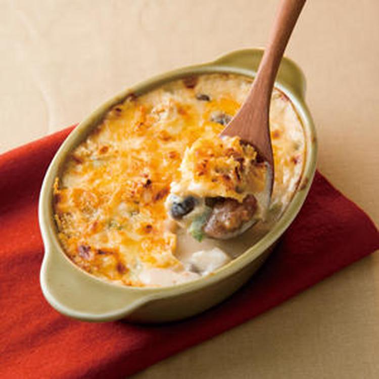 (2)を耐熱容器に入れ、Cをのせてオーブントースターで10~15分焼く。