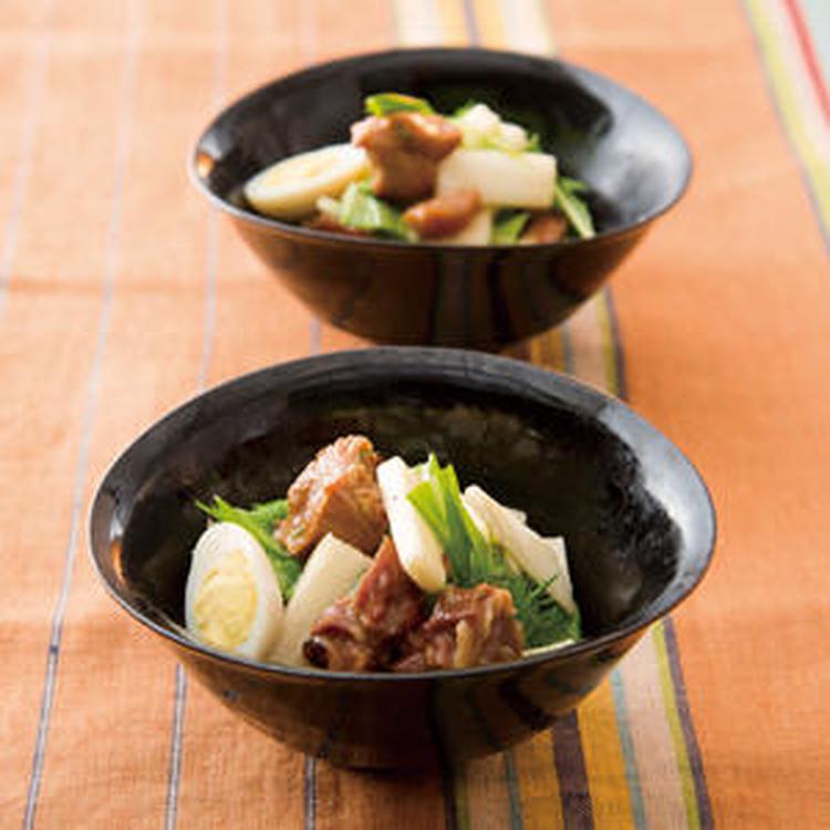 ボウルに長いも、水菜、やきとりをたれごと入れて混ぜる。