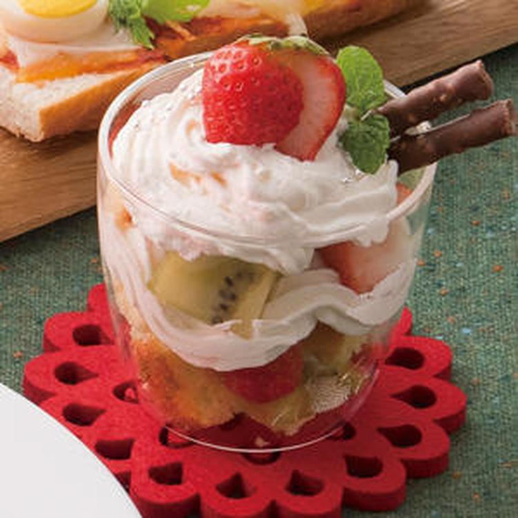 グラスにカステラ、生クリーム、(1)の薄切りいちご、キウイ、生クリームの順に盛り付け、残りのいちご、Aをトッピングする。