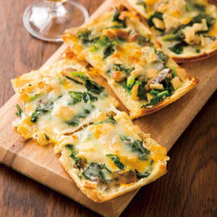 アルミホイルに(1)を並べて(2)、チーズをのせ、オーブントースターで4~5分加熱する。
