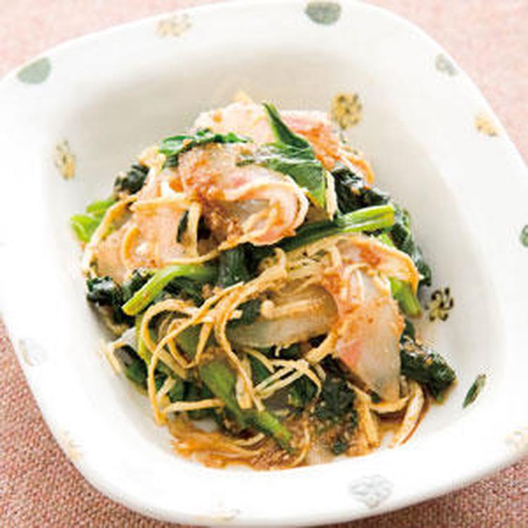 しょうが入り冷凍小松菜をラップに包み、電子レンジ500Wで1分ほど加熱し、水気をしぼる。