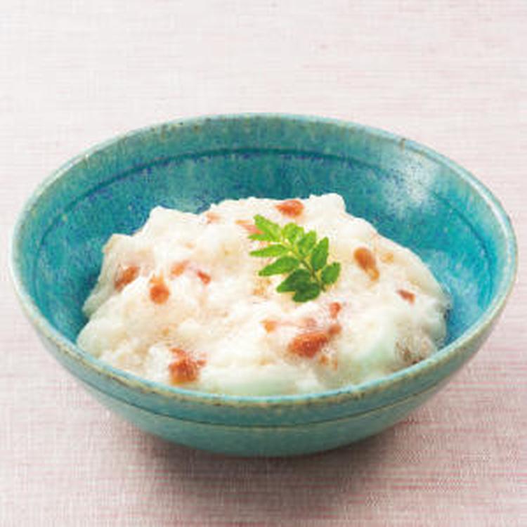 滑らかになったら長芋を加え、更にたたきながら梅干しとなじませ、粗めにつぶす。