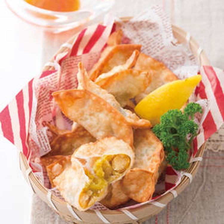 (1)をぎょうざの皮で好みの形に包み、180℃に熱した油で、皮がきつね色になるまで揚げる。