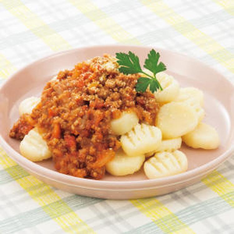 鍋にオリーブ油を中火で熱してAを順に炒め、玉ねぎが透き通ってきたら合びき肉を加えて炒め合わせる。カットトマトを加えて約10分煮込む。