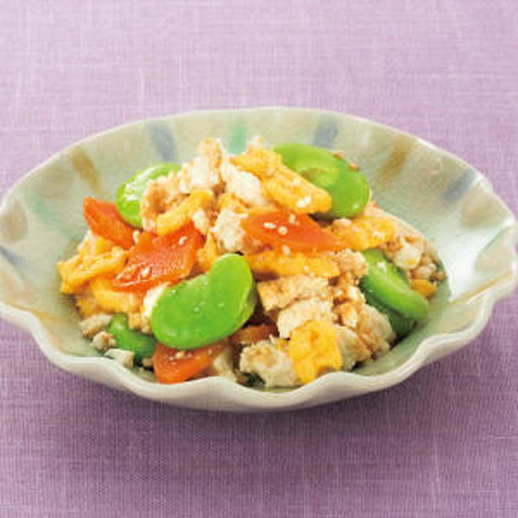 そら豆は黒い部分に切り込みを入れ、塩(分量外)を加えた湯でゆでて薄皮をむく。人参もやわらかくなるまでゆでておく。