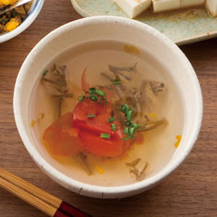 鍋にA、(1)、ミニトマトを入れ、ひと煮立ちさせたら薄口しょうゆを入れてひと混ぜし、火を止める。