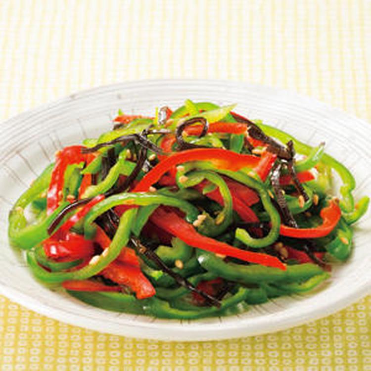 ピーマンは縦2等分にして約3mm幅の斜め薄切りにし、耐熱容器に入れる。ふんわりとラップをかけ、電子レンジ(600W)で約1分半加熱する。