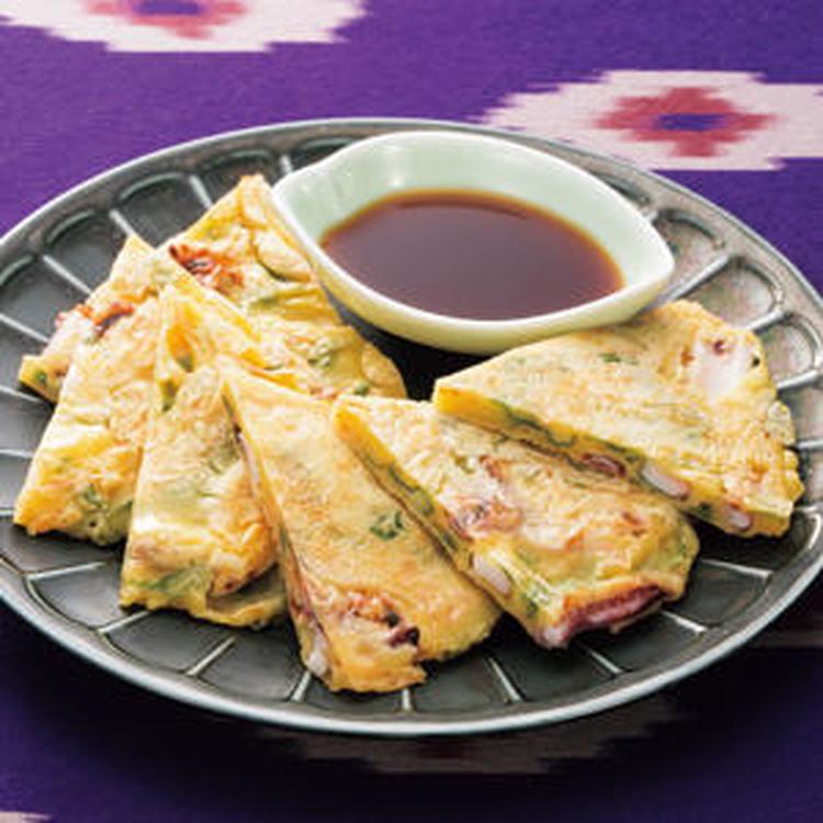 フライパンにごま油を中火で熱して(1)を流し入れ、薄く広げて約3分焼く。こんがりと焼き色が付いたら引っくり返して弱~中火で約2分焼く。