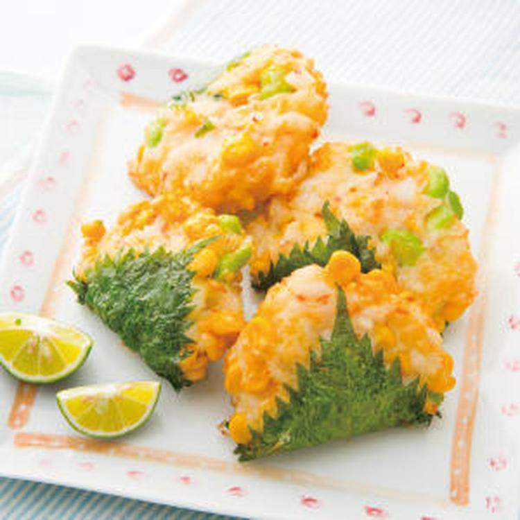 ボウルにはんぺんを細かくちぎりながら入れ、コーン、枝豆、えび、Aを加え、つぶすようにしてよく混ぜ、8等分する。