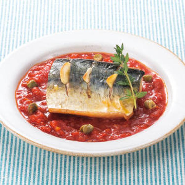 鍋につぶしたトマトの水煮・Bを入れて中火にかけ、ひと煮立ちしたら器に敷く。(2)を盛ってケイパーを散らし、タイムを添える。