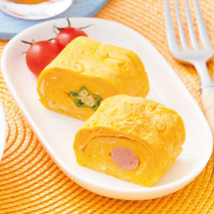 卵焼き器(またはフライパン)を熱してサラダ油をひき、(1)の半量を数回に分けて流し入れながらオクラ2本を芯にして巻いていく。(1)の残りで同様に、ポークウインナーを芯にして巻いていく。
