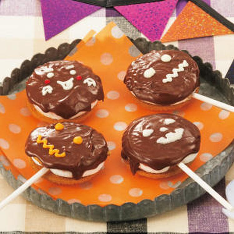 残りのビスケットにマシュマロをのせて電子レンジ(600W)で約20秒加熱し、マシュマロが膨らんだら(1)で挟み、ロリポップ(キャンディ)スティックを刺して冷ます。