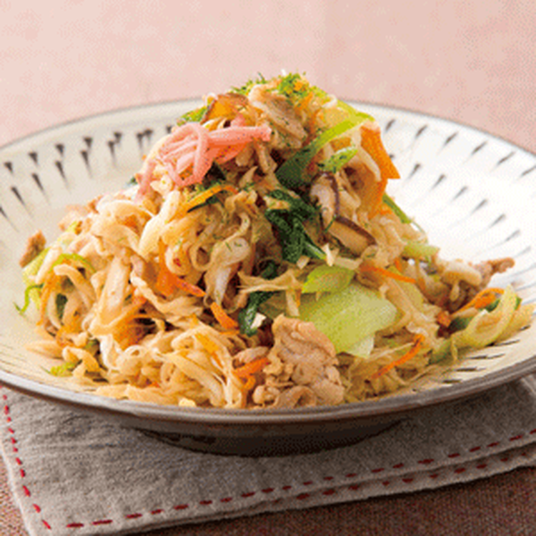 フライパンにサラダ油を熱して豚肉を炒め、色が変わったらA、天かすを入れて炒める。