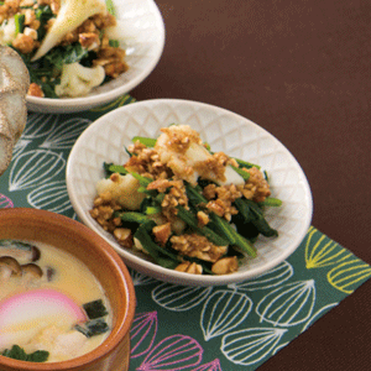 ほうれん草は塩茹でして水に取り、水気をしぼって4cm長さに切る。カリフラワーも一緒に茹で、薄切りにする。