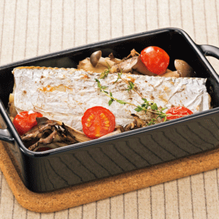 耐熱皿ににんにくの切り口をこすりつけてオリーブ油を薄く塗る。タチウオ・Aを入れてBを振り、タイムをのせてオリーブ油を回しかけ、ミニトマトを散らす。