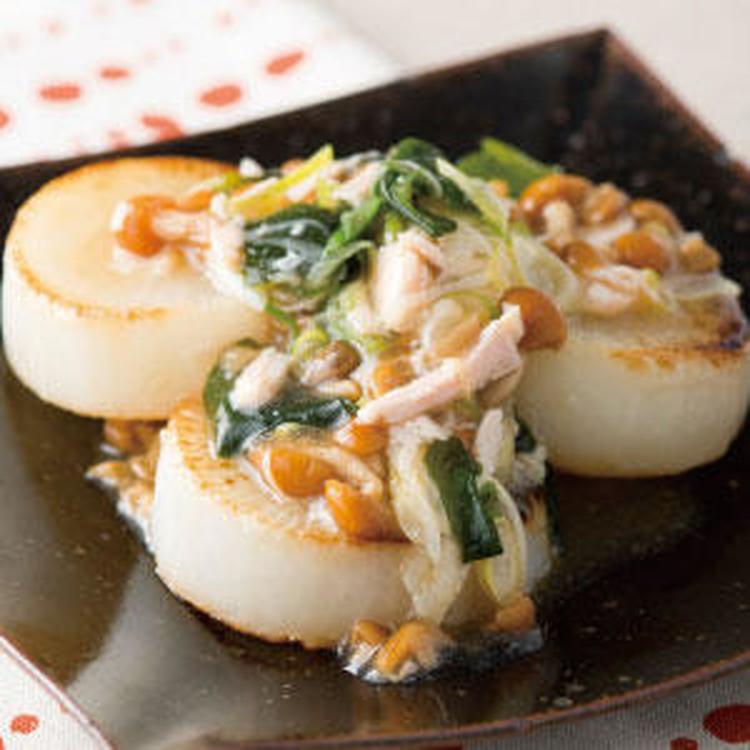 大根は電子レンジ500Wで9分加熱し、ごま油を熱したフライパンで焼き色がつくまで両面を焼く。
