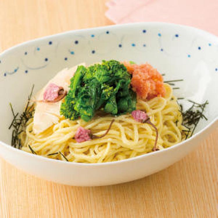 (2)に菜の花、たけのこ、Bをトッピングし、よく混ぜていただく。