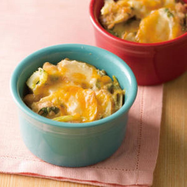 (1)を2個のココットに分けて入れ、ラップをかけて電子レンジ500Wで3分加熱したら、チーズをのせてオーブントースターで焼き色がつくまで焼く。