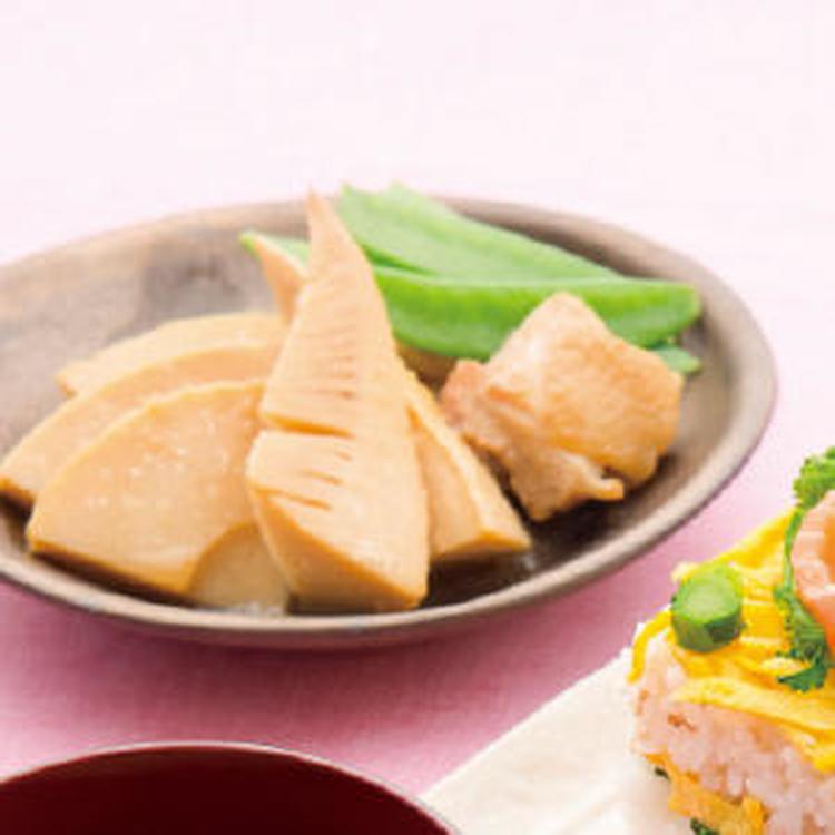 (1)にたけのことAを加え、落し蓋をして弱火で5~6分煮たら、きぬさやを加えてひと煮立ちさせ、器に盛る。
