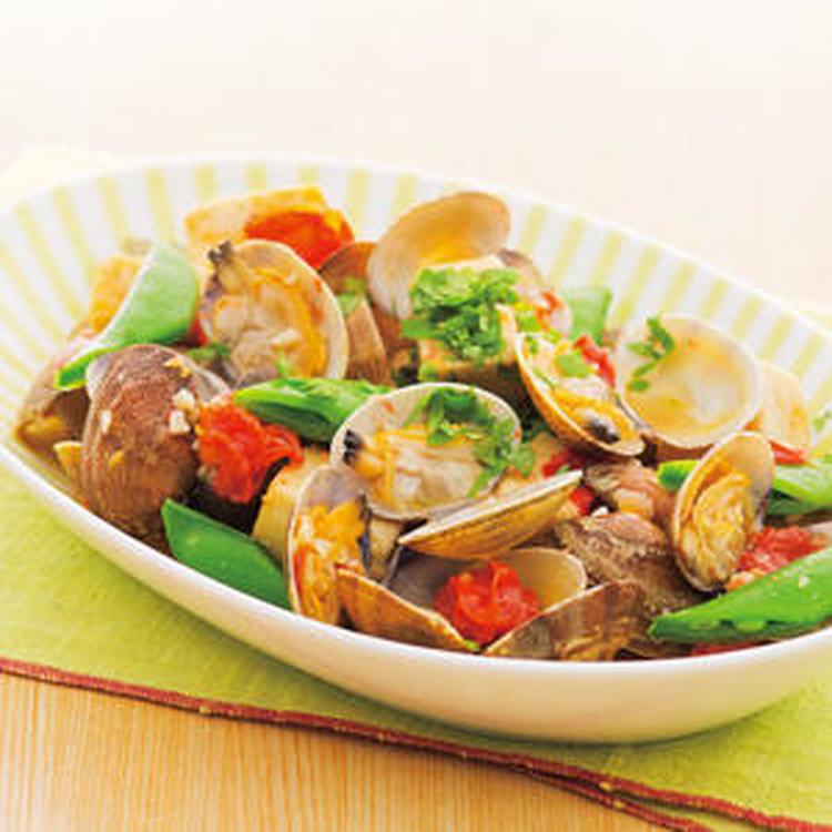 フライパンにオリーブ油、にんにくを入れて香りが出るまで弱火で炒め、(1) 、Aを加えて蓋をし、あさりの口が開いたらこしょうをふって火を止める。
