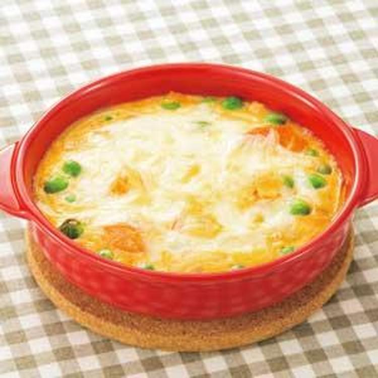 耐熱皿に残りのオリーブ油を塗って(3)を流し入れ、ピザ用チーズを散らしてオーブントースター(1000W)で約18分焼く。