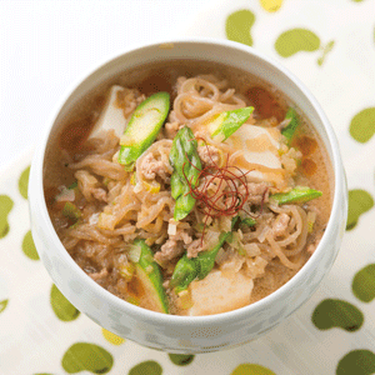 鍋にごま油としょうがを入れて炒め、香りが出たらミンチ、糸こん、長ねぎ、アスパラを順に炒め合わせ、だしを加えてみそを溶き、Aを加えてひと煮たちさせる。