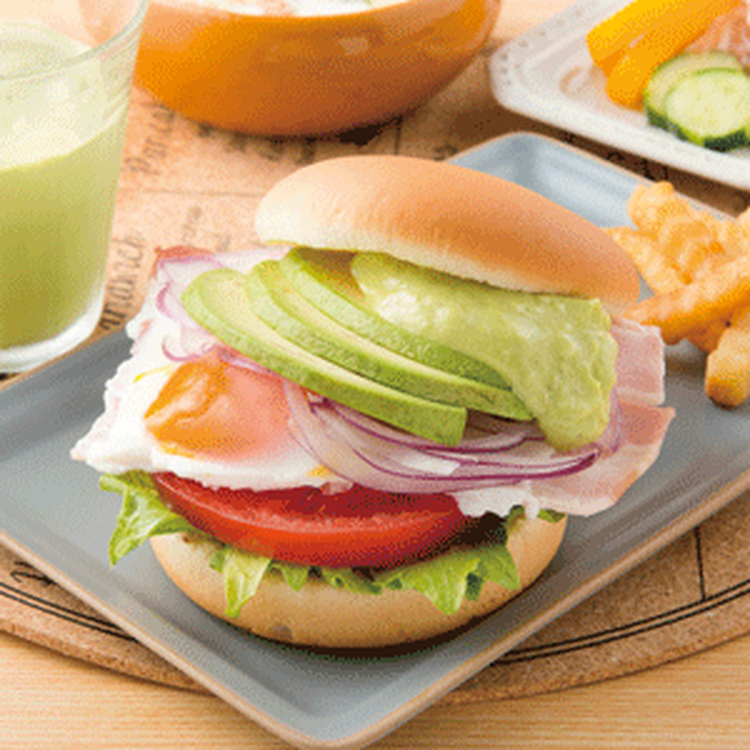 (2)にレタス、トマト、(1)、紫玉ねぎ、残りのアボカドを重ね、(3)をのせてはさみ、器に盛ってポテトを添える。