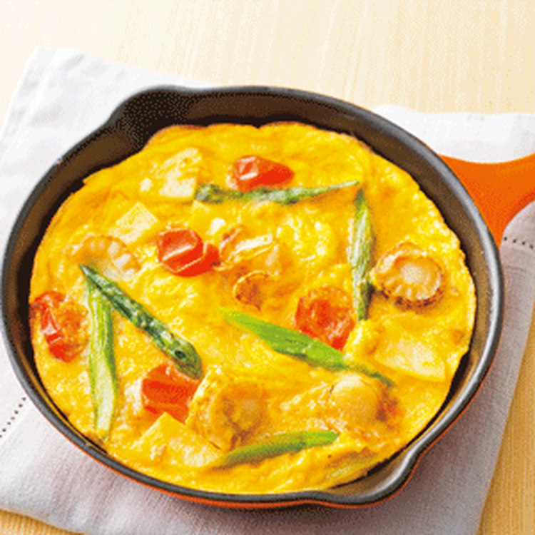 フライパンにオリーブ油を中火で熱し、(2)を入れて手早く混ぜ、半熟状になったら蓋をして弱火で2~3分加熱して、蓋をしたまま火から外し2分蒸らす。(取り出しやすくなる)