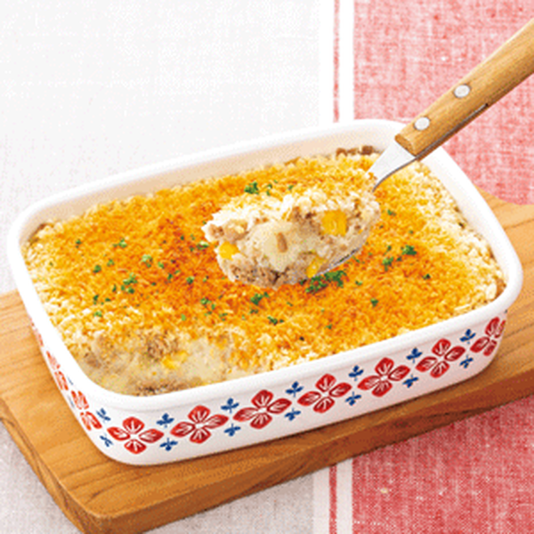 (2)のフライパンにサラダ油を中火で熱して玉ねぎを入れ、透き通るまで炒める。Bを加えてほぐしながらひき肉に火を通し、粒コーンを加えてサッと炒める。