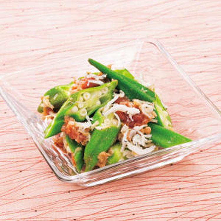 オクラは塩を振って板ずりし、熱湯でサッとゆでる。冷ましてガクをぐるりとむき、斜め3等分に切る。