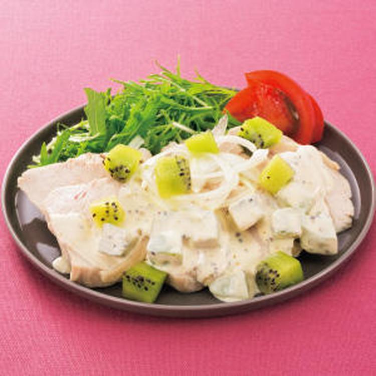 器に水菜を敷いて(3)を盛り、(4)のソースをかける。水にさらして水気を切った玉ねぎ・(4)のとりおいたキウイフルーツをトッピングし、トマトを添える。
