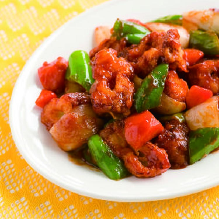 フライパンにごま油を熱し、野菜を炒めたら(1)、Aを合わせた甘酢あんを加えて混ぜ、Cを合わせた水溶き片栗粉を回し入れてとろみをつける。