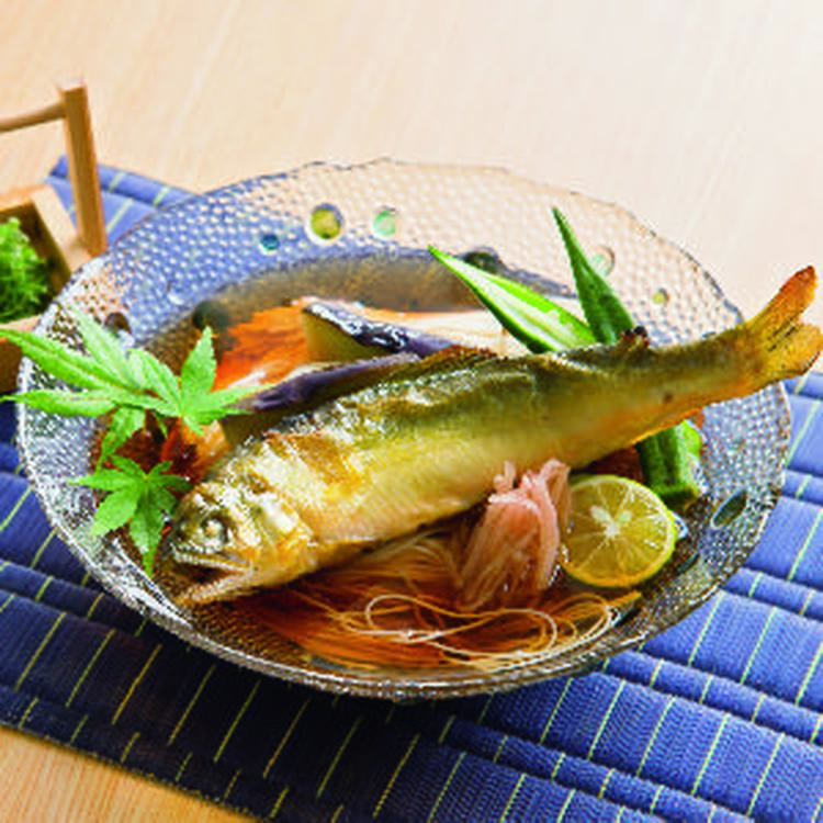 - 鮎(腹側を尾の方へ軽くしごいて穴=肛門から汚物を出し、流水でぬめりを取り水気をふいてから全体に軽く塩をふる) 2尾
