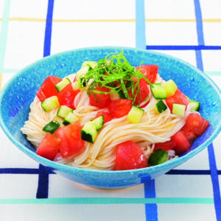 そうめんはパッケージ通りにゆでて冷水で締め、水気を切る。