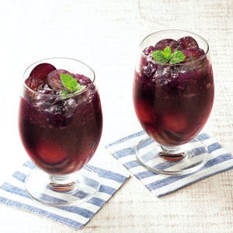 ぶどうは飾り用を皮付きのまま2等分に切ってとりおく。残りは皮をむいて器に入れ、残りの(2)を半量ずつ注ぐ。(2)のバットとともに冷蔵庫で2時間以上冷やし固める。