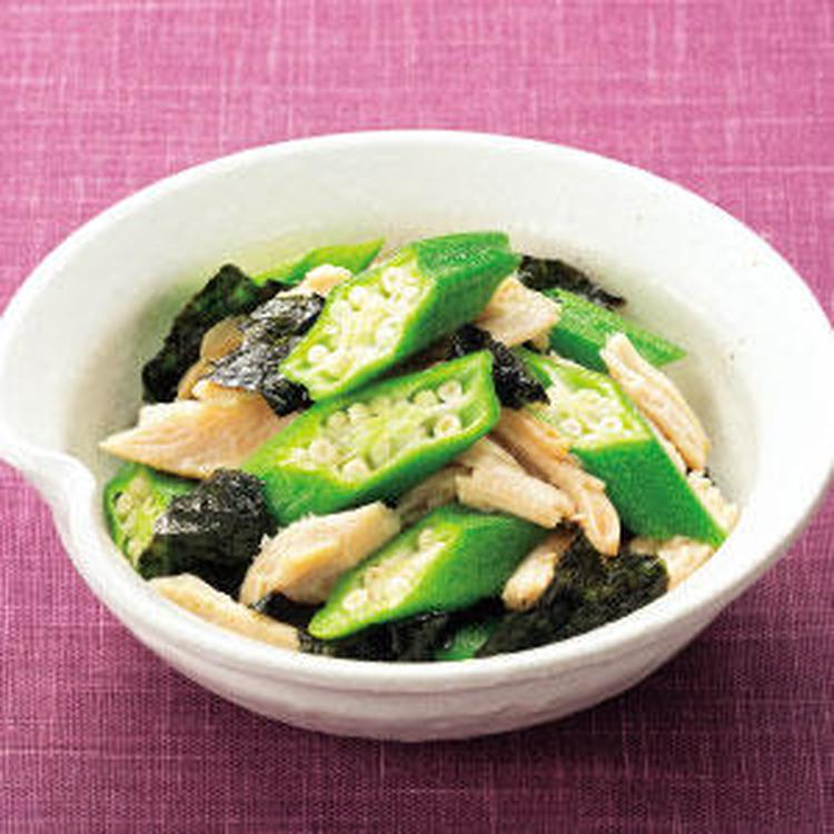サラダチキンをザックリとほぐしてボウルに入れ、韓国のりを大きめにちぎり入れる。(2)・Aを加えてあえ、器に盛る。